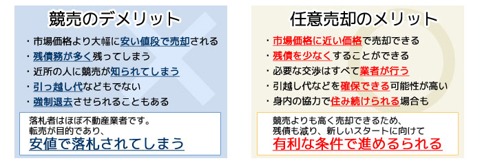 住宅ローンの支払いに行き詰ったとき、最終的には競売で処分するのか任意売却するのかの選択を問われることになるのですが、競売にするメリットはどこにもありません。任意売却で有利なスタートを切るためには、できるだけ早い時期でのご相談が大切です。